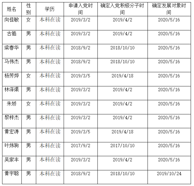 为了加强对发展党员工作的民主监督,保证发展新党员的质量,现将发展对象向佳敏等12位同志的有关情况公示如下(具体名单附后),以便广泛听取意见。经支部委员会审查和研究,拟在近期召开支部大会讨论接收其为中共预备党员。