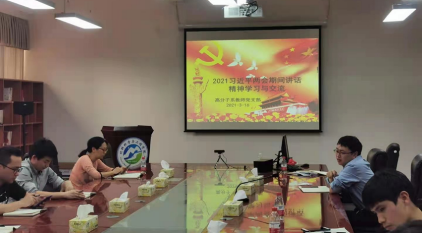 2021年3月16日下午,太阳城高分子系教师党支部在太阳城4B306会议室开展了“学习两会重要讲话精神,落实做四有好老师”主题党日活动。
