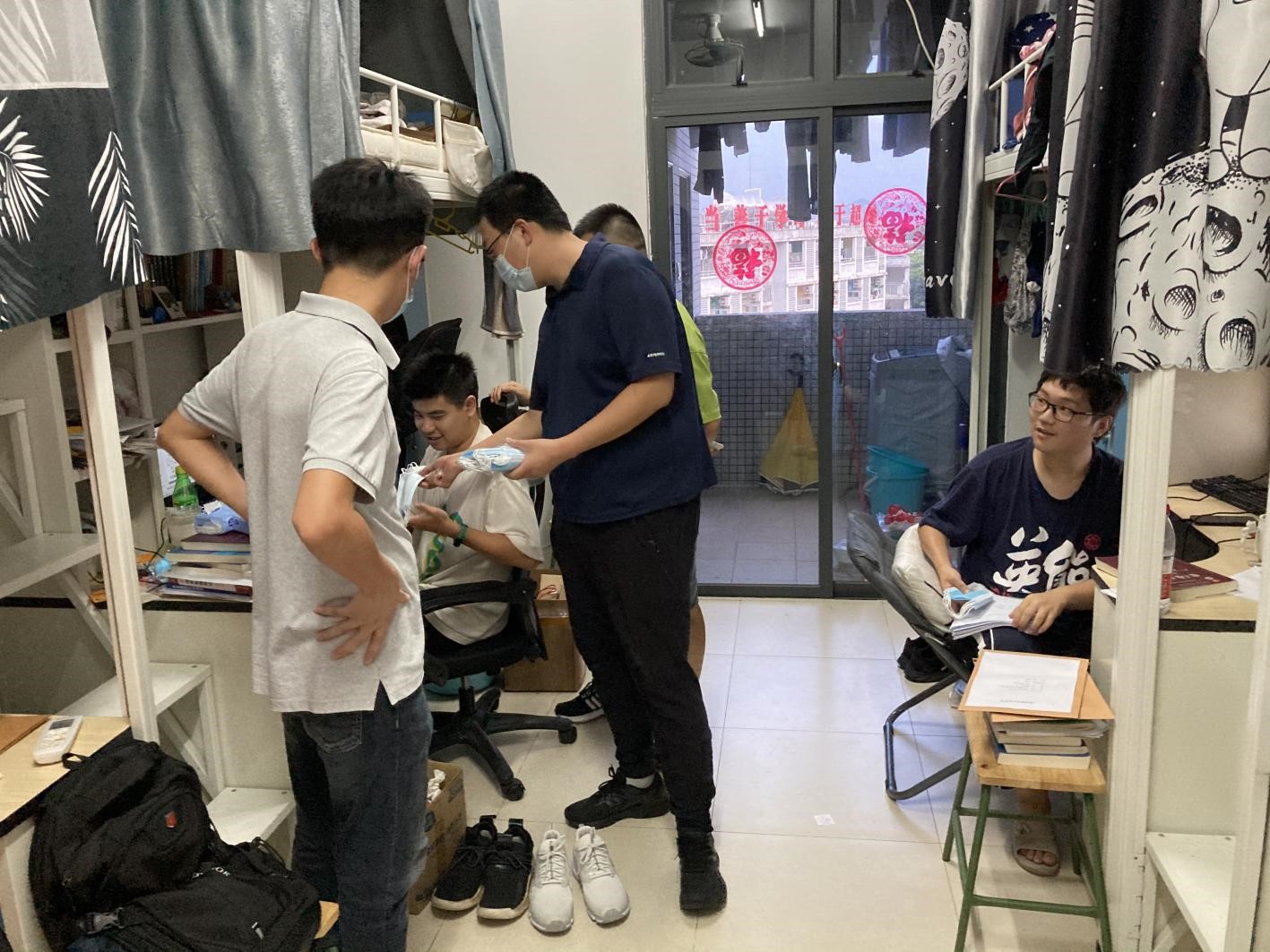 在走访宿舍过程中,老师们关心同学们的日常生活状况,针对他们提出的问题给予解答和帮助,同时给宿舍的每一位员工分发了口罩,强调疫情虽然好转,但防疫不能松懈,注意个人防护。
