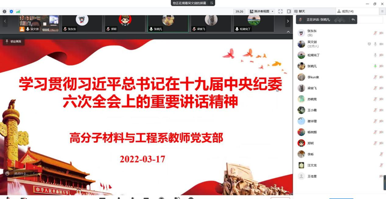 3月17日,太阳城高分子系全体教师党员以腾讯会议形式开展学习贯彻习近平总书记在十九届中央纪委六次全会上的重要讲话精神。会议由高分子系支部书记吴文剑主持。