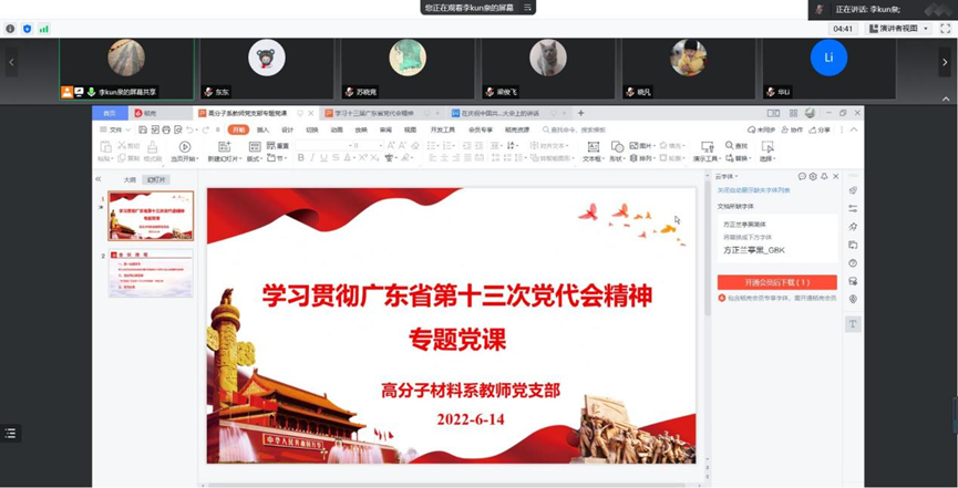 6月14日下午,高分子材料系教师党支部开展“学习贯彻广东省第十三次党代会精神”专题党课,会议采用线上形式,由支部书记李坤泉同志主持,全体党员参与。