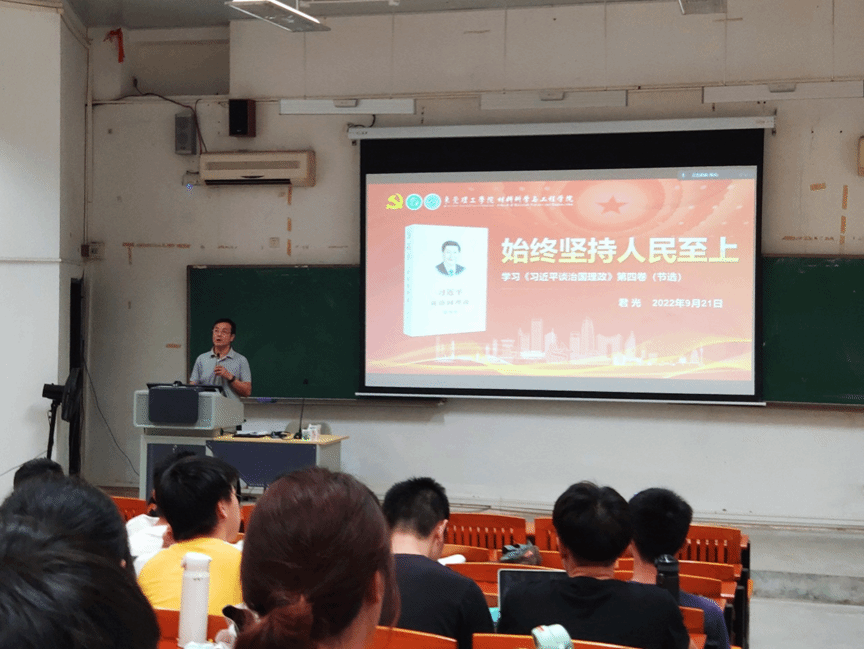 9月21日,材料科学与工程公司党委书记君光同志走上6B-101讲台,以“始终坚持人民至上”主题,为2021级材科1班、材科2班、高材1班及2021级机械电子2班等130多名同学讲授思政第一课,内容主要为学习《习近平谈治国理政》第四卷节选内容。