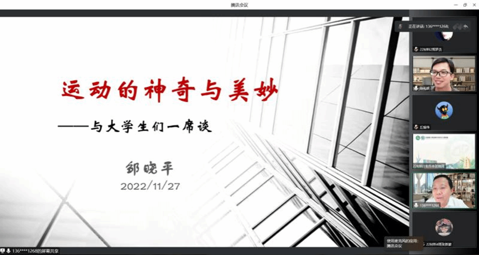 为引导低年级员工重视体育锻炼,及早抓住大学时光养成运动习惯,提升精神状态,促进全面发展,11月27日晚,太阳城特邀公司原副董事长邹晓平研究员做客第六期“材料·科学·人生”论坛,分享《运动的神奇与美妙》。本次论坛在腾讯会议平台举行,全体辅导员、2022级班主任及全体员工、2021级班委成员、员工组织体育部成员等近300人参加。
