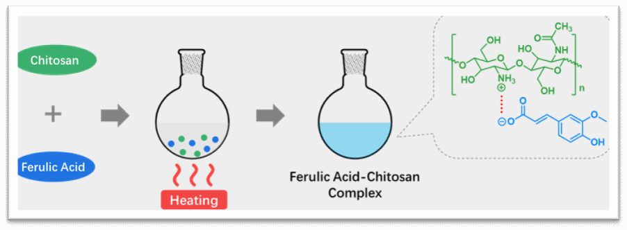 该文献首次报道了一种在水中成功制备壳聚糖-阿魏酸络合物的方法。将壳聚糖和阿魏酸在80℃以上的水中加热,即可得到壳聚糖-阿魏酸的络合物,无需添加任何额外的催化剂或助溶剂。这种热辅助合成方法巧妙克服了壳聚糖和阿魏酸的溶解难题,为壳聚糖和阿魏酸的改性和使用带来极大的便利。论文详细研究了壳聚糖-阿魏酸络合物的化学结构、热稳定性、抗氧化性和细胞毒性。MTT测试表明该络合物具有很低的细胞毒性,同时ABTS测试显示它具有比阿魏酸更高的抗氧化能力。随后,研究人员将该络合物作为安全抗氧化剂,成功应用在新鲜苹果汁的保鲜中。由于制备方法简单、水溶性良好和抗氧化性能出色,壳聚糖-阿魏酸络合物有望大规模应用于食品、化妆品和医药等领域。