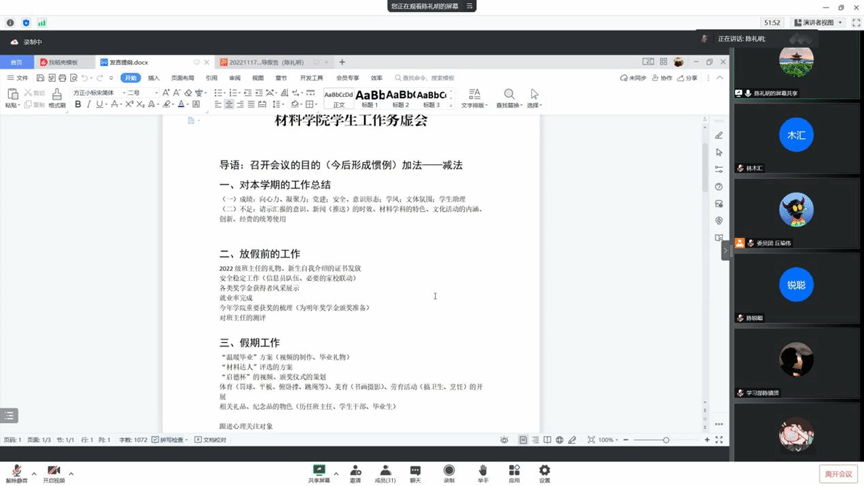 辅导员陈锐聪老师对一年来在疫情防控形势下,员工组织仍能够确保各项活动的高质量完成表示赞许,他建议员工组织要着眼于当下,如寒假期间通过举办如劳动教育、美育等线上活动,充分发挥员工组织对员工群体的良性引导作用。针对目前疫情防控的发展趋势,他要求各员工组织发散思维,思考规划好如何能够举办更加新颖、有趣的活动,同时呼吁员工组织新成员应把握机会,通过参与活动策划与开展来磨练自身,在提升自身能力的同时提高思想认识。